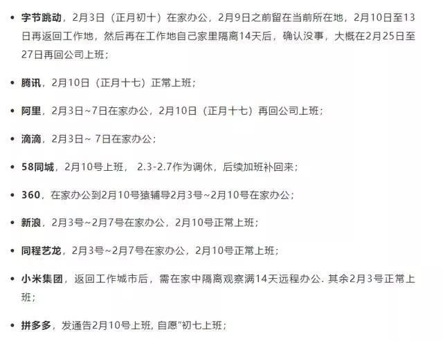 于是,各省市纷纷发布延期复工规定,大部分都定在2月10日复工。互联网公司率先响应号召,安排员工于2020年2月3日-2月9日在家远程在线办公,2月10日正式复工。