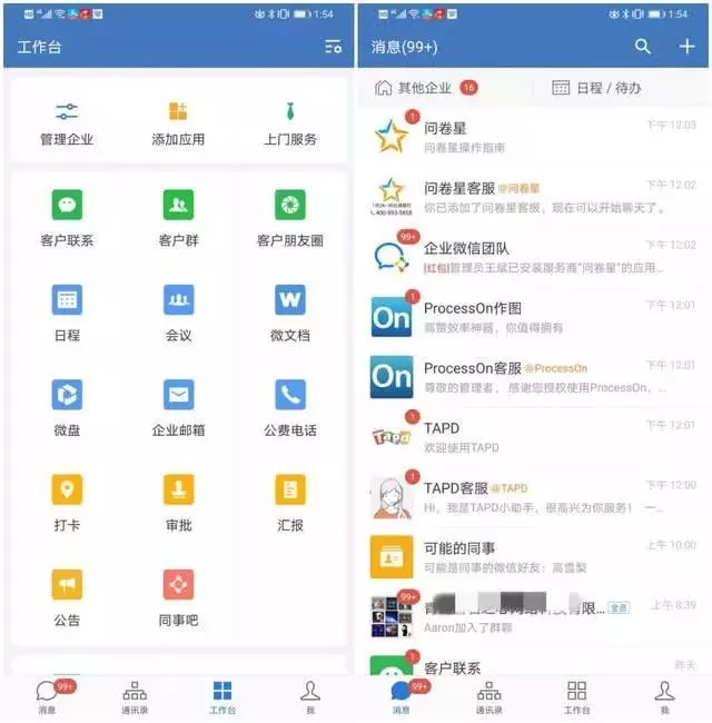 加入企业微信后,员工不仅可以沟通工作,还可以在企业微信上进行打卡、审批、汇报、联系客户等移动办公。