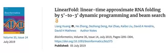 本次可大大加快 RNA 结构预测速度的LinearFold算法,百度于2019年7月首次提出。该算法使得整序列、整基因组的 RNA 结构预测成为可能,也是 RNA 结构预测领域 40 年来第一次重大提速。这项工作发表于生物信息学顶级会议 ISMB 2019 和生物信息学权威杂志 Bioinformatics,受到了诸多业内专家的高度评价。