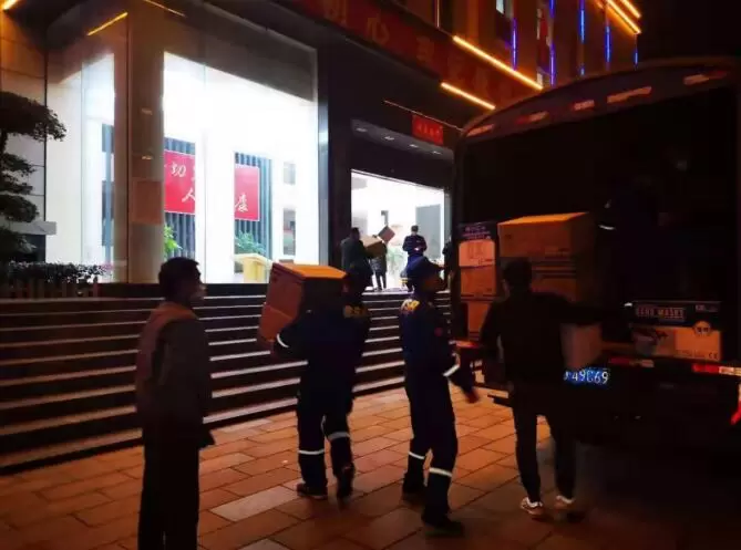 图:1月29日晚,58同城捐赠的医疗物资运抵武汉并搬运入库