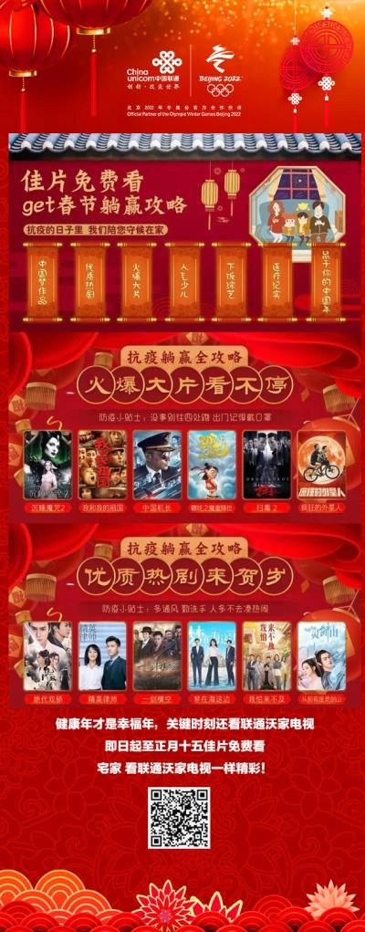 宅在家中,减少外出,是当前全国抗击新冠疫情扩散的关键手段。为配合国家疫情防控及延迟放假工作安排,满足广大用户宅家观看精品视频内容的迫切需要,中国联通组织开展了IPTV及5G沃视频免费观影活动,推出包括影视、教育、健康、生活等在内的IPTV及5G沃视频免费精品内容,把众多精彩节目内容免费在大小屏上提供给用户,陪伴亿万人民宅家度过一个健康、平安和精彩的春节假期。