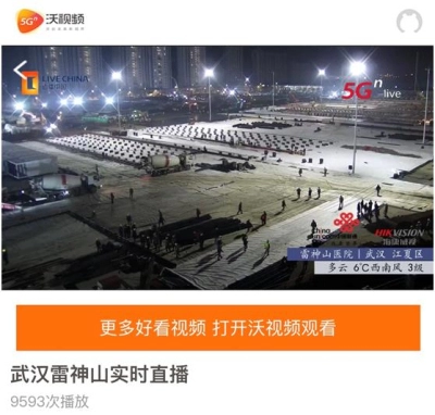 当火神山、雷神山两处工地现场直播开通后,中国联通于1月29日第一时间携手央视网在5G沃视频客户端开通武汉火神山、雷神山医院建设24小时实时直播,与广大用户一起星夜守望,见证与疫情比拼的中国速度。