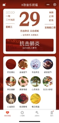 为让用户更好地传递个性化的音乐祝福,全民K歌小程序的定制祝福页面同步上线了抗击疫情专区,用户可通过挑选并录制相关内容进行朋友圈分享或发送给好友来传达特殊时期的祝福,祝福的内容中不仅有一首饱含心意的歌曲,还有转自权威媒体的抗击肺炎实时防护知识。目前已有近35万用户响应参与。