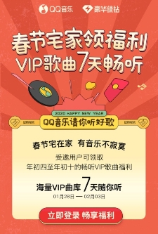 1月28日,为鼓励疾控响应号召在家宅着的人们,QQ音乐再推出“VIP歌曲7天畅听”活动,受邀用户可领取年初四至年初十的VIP歌曲畅听权益,为用户的宅家生活提供了娱乐福利,用音乐陪伴和鼓励大家积极乐观。