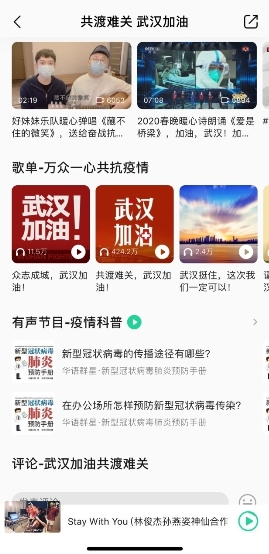 随着疾控工作的进程,1月29日,QQ音乐首页焦点图进一步上线了“共渡难关 武汉加油”的防疫科普专区,推出结合加油歌曲、达人歌单、视频、评论、用户讨论区、有声电台等多媒体形式的矩阵内容,其中防疫知识内容的更新多选自新华社、人民日报、央视等权威媒体的实时宣传,确保了正确疾控知识与资讯的普及。