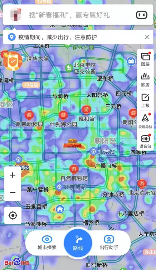 打开百度地图的热力图图层,用户可以查看到实时的人口流量密度,以此来决定出行路线,避开商圈、交通枢纽等人流密集场所。