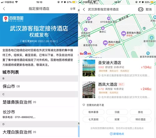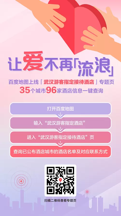 百度地图根据武汉市文化和旅游局官方发布信息,于1月29日特别紧急上线了“武汉游客指定接待酒店” 专题页面,聚合来自各地的集中接待信息,方便在外的武汉及湖北游客更快找到所在城市的指定接待酒店。截至目前,百度地图已上线了35个城市96家指定接待酒店,并将持续跟进最新信息,充分发挥平台信息整合优势,保障人民的生命健康安全。