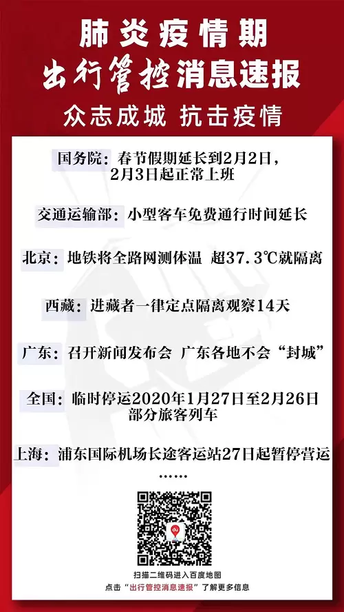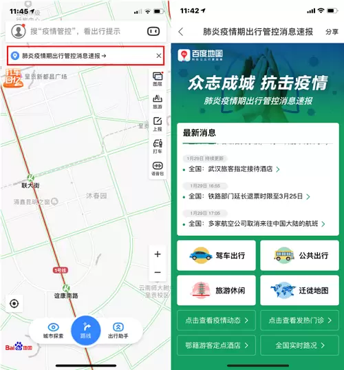 为便利公众了解肺炎疫情实时消息、掌握各地出行路线封堵情况、获取就诊信息与服务,百度地图于1月27日(大年初三)上线“肺炎疫情期出行管控消息速报”页面。该页面实时更新疫情最新消息动态,聚合疫情期百度地图驾车出行、公交出行、旅游休闲、迁徙地图、发热门诊查询、湖北籍游客定点酒店、全国路况平台等功能入口。用户通过百度地图首页上方的黄条提示,即可进入该聚合页面,及时获取疫情相关信息,并依据页面标识指引快速找到所需出行、就诊等功能服务。