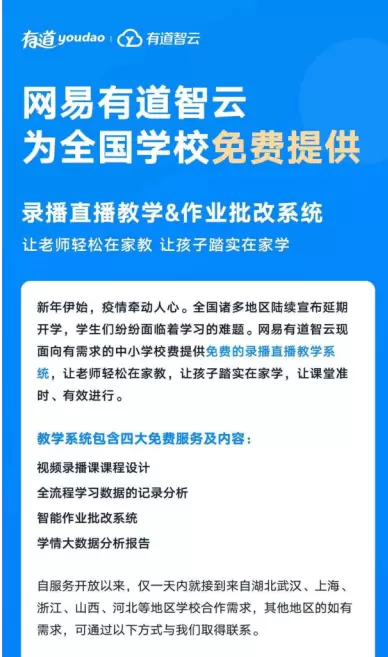 随着新型冠状病毒感染的肺炎疫情的扩散,全国各地区陆续宣布延期开学,为了支持与保证各地学校正常的教学进度,缓解因延迟开学带来的不便,网易有道旗下AI开放平台——有道智云向全国中小学校及培训机构提供免费的远程教学系统。