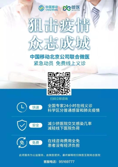 另外,为抗击疫情,中国移动北京公司还联合微医共同开展免费在线问诊,扫描下方二维码,登陆北京移动APP首页,查看“在线问诊”服务,全国专家24小时在线问诊,为你实时解答疫情疑问并提供就医指南。抗击疫情,中国移动和你在一起!