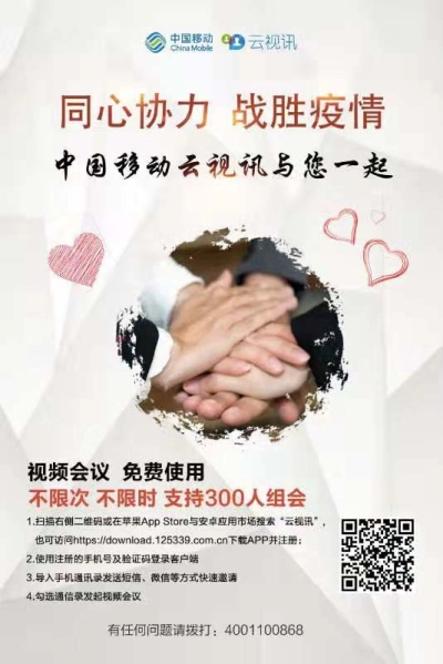 新型冠状病毒引发的肺炎疫情形势严峻,截止2月1日9点的全国数据,全国共确诊人数已经破万。疫情当前,全国人民、各行各业都在积极抗击新型肺炎,多地延期返工,开启“在家办公模式”。为保障各企业在线高效办公,中国移动现已免费开放云视讯App会议服务功能,在新型冠状病毒感染肺炎疫情期间,面向社会提供单次300人同时在线不限时、不限次的视频会议服务,免收功能费,助力全国打赢疫情防控阻击战。