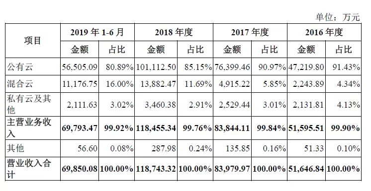 总体来看,公司营收保持在年均50%的增长速度。招股书显示,2016 -2018,公司总营收分别为5.2亿元、8.4亿元、11.8亿元。其中,主营业务(公有云、混合云、私有云及其他)占总营收比重超99%。