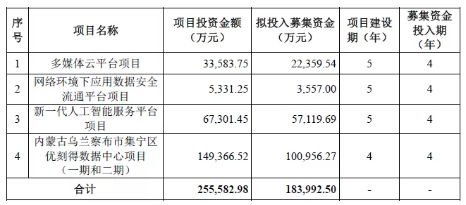 结合以上公司未来发展战略,公司的募资计划也围绕CBA战略展开。本次募资超18亿元,其中10亿元用在内蒙古乌兰察布市集宁区建立优刻得数据中心项目,这是因为云计算企业的资源数量和质量是重要的生产要素,数据中心、专线与带宽、服务器是核心资源。不过,这也将导致未来新增折旧金额出现大幅增长,公司预计该项目将在3年后实现规模化盈利。