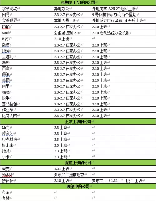 目前,在互联网公司公布的企业延期复工通知中,可以看到,大多数互联网公司把假期延迟到2月2日,之后通过在公司驻地城市或者远程办公的形式作为上班前疫情防控的过渡期,过渡期结束后,再让员工返回企业正式工作。知名互联网公司网易把春节假期延迟到2月2日,2月3日-2月7日实行在家办公,9号回到公司总部驻地杭州后再在住所办公两个星期;社交行业互联网公司陌陌放假到2月2日之后,2月3日-2月7日实施在家办公,2月10日返回公司上班。而作为近年来社交领域新兴互联网公司Soul,为了更好得保障员工生命安全和身体健康,结合国务院和上海市防控工作部署要求,直接把春节公假延迟到2月9日。2月10日启动远程办公机制,之后在工作地家中隔离观察14天。除此之外,Soul还制定了周密的突发状况应急预案,最大限度保障员工生命健康安全。Soul成立3年以来,已经从当初数十人的团队成长为500余人的大家庭,在这次疫情爆发期间,Soul非常重视团队员工的身心健康情况,通过实际行动让每一位Soul星人感受到大家庭的温暖。