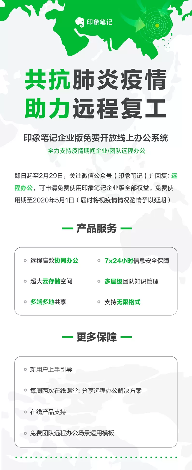 此次免费使用截止日期为2020年5月1日,届时将视疫情发展酌情予以延期。在此期间,印象笔团队还将为用户提供免费的远程办公在线课堂、7×24小时信息安全保障等一一系列保障服务——为中小企业及团队提供最完善的办公生产基础设施。