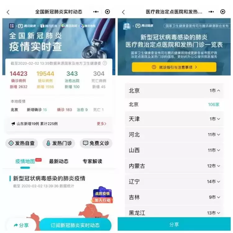此外,疫情期间,为了方便银行用户获取疫情动态及防控工作讯息,西安银行还将公众号与腾讯健康小程序完成对接,公众号用户点击工具栏中的“发热自查”即可进入腾讯健康小程序,获取新冠肺炎自主诊断工具,包括发热门诊查询、免费义诊、确诊患者行程查询、专家辟谣平台等。