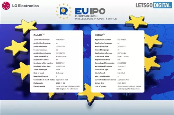 据荷兰科技博客LetsGoDigital报道,近日LG电子向欧盟知识产权局(EUIPO)申请了四个新商标,分别为:MOLED,PELED,MicLED和i-LED。从名字来看,四款新材质屏幕可能是现有LED和OLED屏幕的衍生版本。