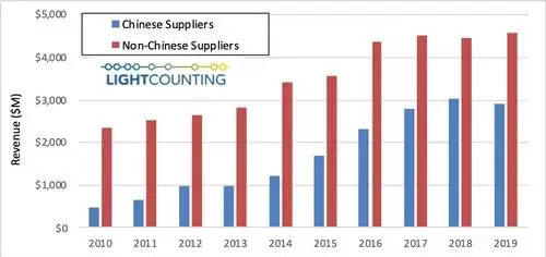随后不久,中国的本地企业很快就从西方公司那里学习并开始复制光器件和模块的制造。到2010年,中国光器件供应商的销售额超过5亿美元,到2018年增长至30亿美元,在2019年略有下降,如下图所示。