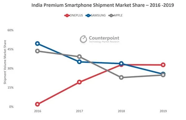 除了出货量上,市场调研机构Counterpoint Research发布了2016年至2019年印度高端智能手机市场份额统计,统计显示,一加超越三星苹果,成为印度高端市场NO.1。数据统计范围为售价高于30000卢比(约合人民币2900元)的智能手机份额,数据显示,2019年印度高端手机市场出货量同比大增29%,达到历史新高。