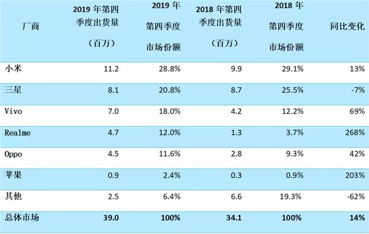 在出货量上,小米在第四季度增长13%至1120万部,全年出货量从2018年的4100万部稳步上升至4290万部。三星位居第二,第四季度同比下滑7% 至810万部,2019年全年出货3230万部略逊于2018年全年的3540万部。
