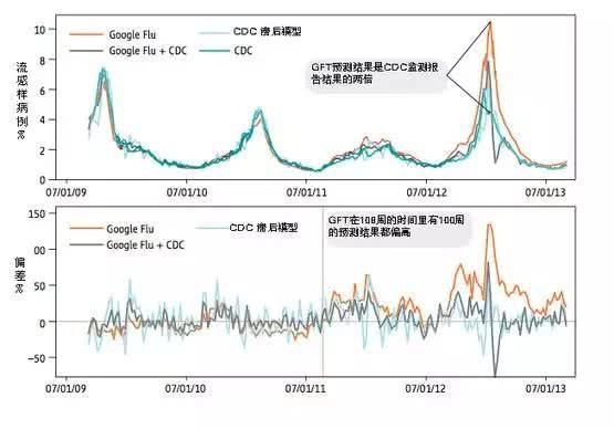 然而,预言神话没有持续多久。2014年,GFT又再次受到媒体关注,但这一次却是因为它糟糕的表现。研究人员2014年又在《Science》杂志发布 “谷歌流感的寓言:大数据分析的陷阱” 一文,指出在2009年,GFT没有能预测到非季节性流感A-H1N1。从2011年8月到2013年8月的108周里,GFT有100周高过了CDC报告的流感发病率。高估了多少呢?在2011-2012季,GFT预测的发病率是CDC报告值的1.5倍多;而到2012-2013季,GFT预测流感发病率已是CDC报告值的2倍多。