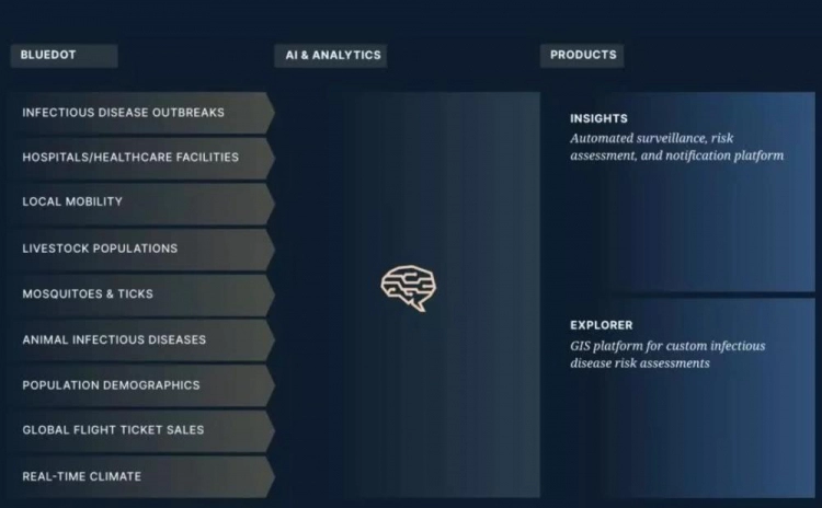 BlueDot采取了另外一项策略,即医疗、卫生专业知识和人工智能、大数据分析技术结合的方式,去跟踪并预测流行传染病在全球分布、蔓延的趋势,并给出最佳解决方案。