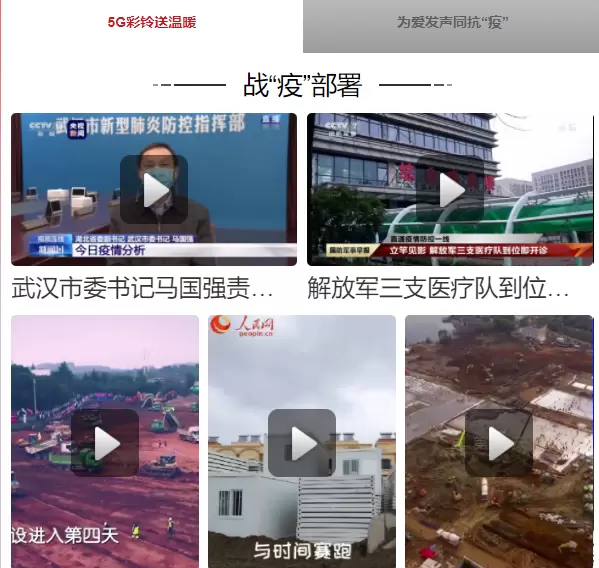 近期,为确保广大人民群众第一时间收到权威准确的信息,引导群众正确看待疫情,汇聚抗击疫情正能量,联通在线沃音乐推出“合力战役 中国加油”5G彩铃公益专区,将疫情相关信息以视频形式推送到每位用户手中,利用人们在拨打电话等待接听的碎片时间对疫情有更全面的了解,让党和政府的声音,疫情防护引导,疫情常识普及,直达一线、进入千家万户。
