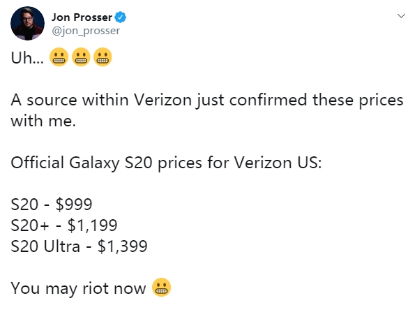 2月4日消息,爆料人Jon Prosser推特称一位Verizon人士向其透露了Galaxy S20系列的价格。