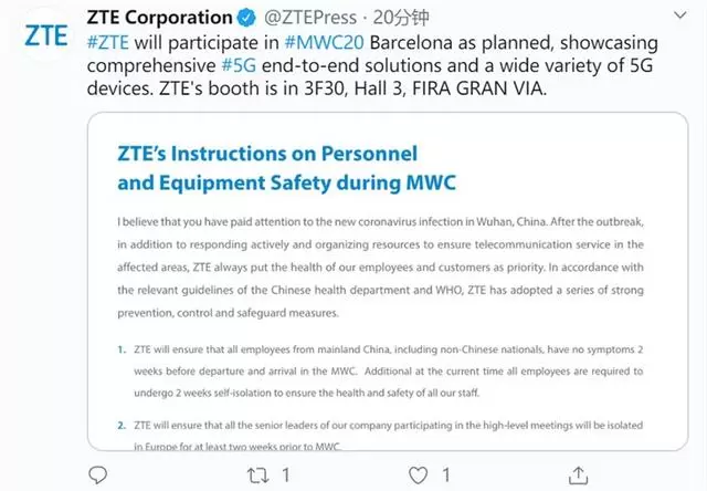 中兴的官方推特内容称,“中兴将按计划参加MWC2020,展示全面的5G端到端解决方案和多种5G设备。中兴的展位在FIRA GRAN VIA 3号馆3F30。”中兴还表示,将确保前往MWC两周前中国大陆的人员无感染症状,中兴高层人员还在参加高级别会议之前 在欧洲隔离两个星期。除此之外,中兴的设备和展台也会每天消毒。