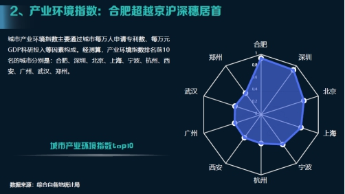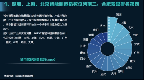 在打造高水平智能制造的过程中,除了企业自身的努力,良好的产业环境也能为有志于投身其中的企业提供必不可少的“地利”。近日,21世纪产业研究院对外发布2019中国智能制造指数(CIMI,China Intelligent Manufacturing Index)报告,从政策环境、产业环境、产业发展、绿色制造等指标出发,展现出中国智能制造发展全景图。在城市智能制造指数综合排名中,合肥市位于深、沪、京之后位居第四位。在产业环境指数上,得益于在城市专利申请数上以及科技研发投入方面的出色表现,合肥更是超越后三者跃居第一名,成绩令人瞩目。