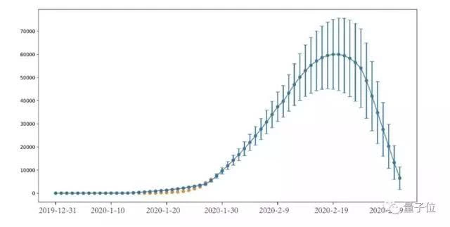 △橙色为实际数据,蓝色为误差范围内的模型预测数据,纵轴是确诊病例