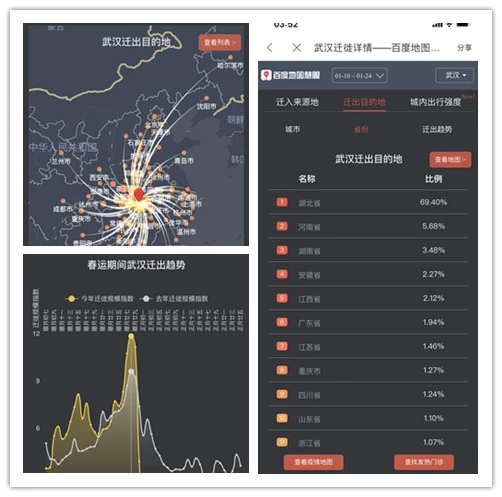 例如,百度地图推出迁徙地图总结描绘出了全国春运人员迁徙热力图,包含来源地、目的地、迁徙规模指数、迁徙规模趋势图等,为各地疫情防控决策提供了大数据支持。