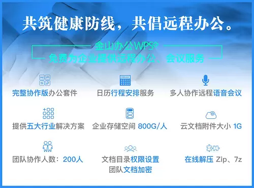 面对疫情来袭,“WPS+云办公”将开放更多办公服务给到企业,为企业提供免费的远程办公服务,助力中小企业顺利渡过难关。