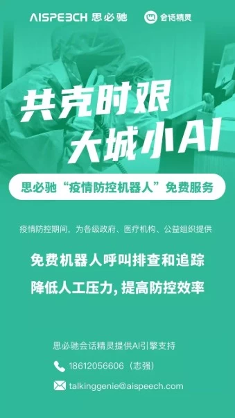 春节期间,新型冠状肺炎疫情在全国蔓延,形势愈发严峻,思必驰作为专业的对话式人工智能平台公司,思必驰及员工们立即决意为阻击疫情献出自己的一份力量。于1月29日推出“疫情防控机器人”,为战斗一线的各级政府、医疗机构、公益组织等,提供人工智能呼叫排查、追踪的免费服务。