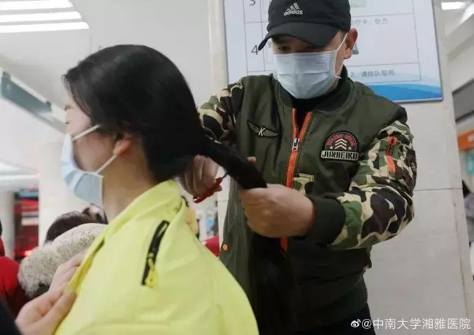 据院方介绍,为了防护需要,中南大学湘雅医院第三批援鄂国家医疗队队员在出征前做了同一件事:理发,男医生剃光头发,女护士剪成短发。