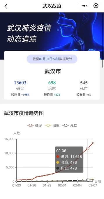 具体而言,小程序通过接入湖北省卫健委的数据,确保市民及时获取到权威、正确的疫情数据信息,同时通过疫情趋势图,让市民更清晰的看到疫情发展态势。