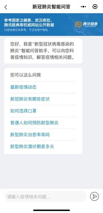 此外,基于腾讯云提供的7*24小时全天候在线智能客服,“武汉战疫”向市民提供智能问答的服务。市民可以提出类似疫情最新动态、如何选择口罩、如何预防新冠肺炎等问题,平台将参考国家卫健委、武汉疾控、腾讯医典等权威网站公开信息给出相应回答,为市民提供新冠肺炎、疫情等方面更权威的信息,让市民对疫情问题做到心中有数。