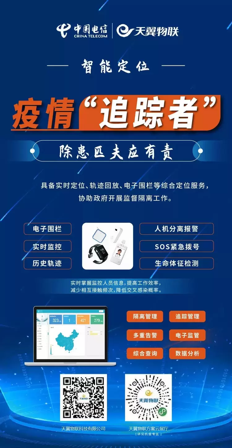 根据国务院部署的肺炎疫情防控工作,“不要出门”是最好的防疫,疑似人员需要定位、隔离和监控。在这场抗疫攻坚战中,做好自我约束,人人应有责。中国电信天翼物联构筑了具备实时定位、轨迹回放、电子围栏等功能的综合定位方案,通过手环、电子证件等多种形态的终端,实时掌握疑似感染人员的位置信息,以防其随意流动,提升监管工作效率。而针对确诊病人,可实现确诊前期行动轨迹查询,挖掘潜在的被感染者。