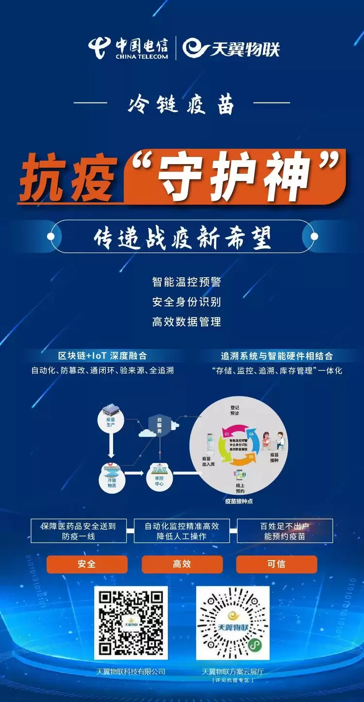 以中国电信物联网+天翼云为依托,中国电信天翼物联为冷链疫苗各环节监管提供智能硬件+连接+云服务的整体解决方案,实现信息互联互通,搭建起“全链条、网络化、严标准、可追溯、新模式、高效率”的冷链疫苗仓储物流体系。通过区块链等新技术,串联前端生产厂家信息,助力解决疫苗管理难题,真正形成疫苗全流程追溯管理解决方案。