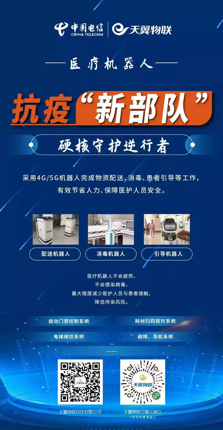 如何助力逆行者安全、便捷地开展抗疫工作?中国电信天翼物联充分运用5G、AI、物联网等技术,面向医疗机构提供智能引导机器人、智慧消毒机器人以及医疗物资配送机器人等服务。改善医疗服务水平、完成院感控制以及远程消毒、实现医院内物资的精准配送等。医疗机器人不会疲劳,更不会感染病毒,能够最大程度地减少医护人员与潜在患者直接接触的概率,降低被传染风险。