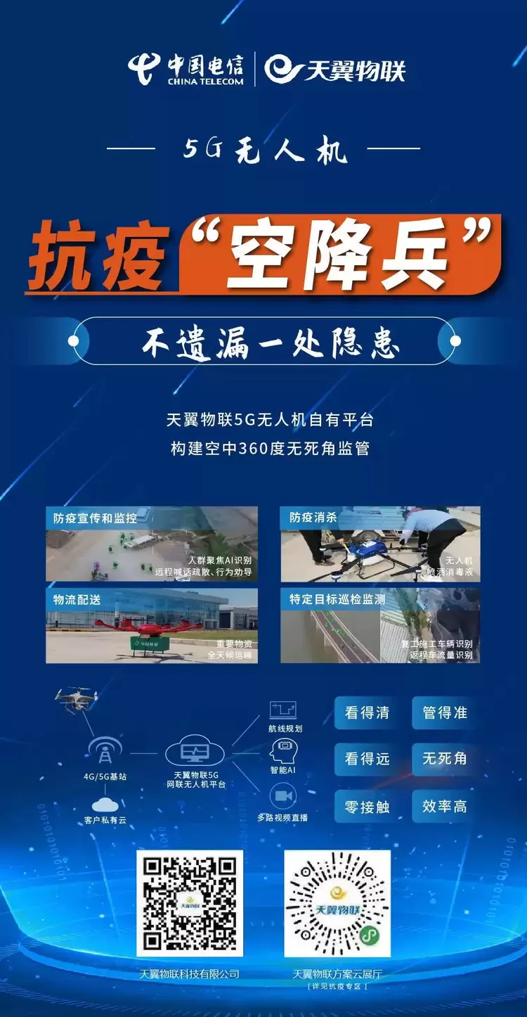 中国电信天翼物联基于自有5G网联无人机平台,融合移动通信网、智能视频云、无人机远程管控等能力,提供无人机一体化服务。在防疫消杀、防疫宣传监控、防疫物资配送以及重点防疫目标巡检等场景化应用中大展身手。无人机应用持续深入到疫情防控一线,不仅提高了抗疫工作效率,更提升了抗疫宣传效果,有效降低了直接接触带来的风险。
