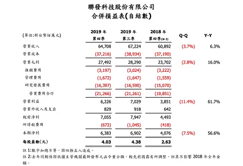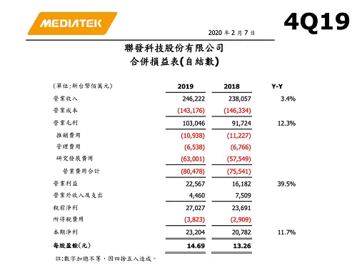 MediaTek 2019年第四季度财报数据。(图/联发科官网)