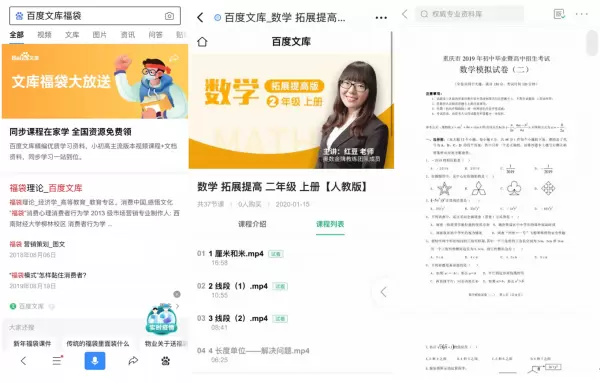 在此期间,百度文库于2月1日向武汉地区师生提供免费会员月卡,开放名师课程、名校试卷、教学资源等海量学习资料帮助武汉的师生在家备课、学习。2月5日,这份特殊福利又扩大到全国范围,用户只需在浏览器搜索框中输入“百度文库福袋”或者进入百度文库APP,就可以免费获得名师课程、名校试卷、教案学案、疫情防护知识等教育资源,以及首次提供的包含北京知名学校骨干教师分享的系列同步视频课程。