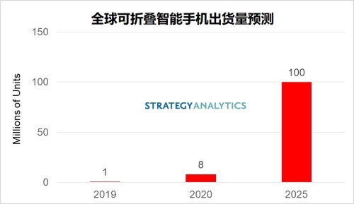 Strategy Analytics副总监Ville-Petteri Ukonaho表示:“我们预计全球可折叠智能手机的出货量将从2019年的不足100万部增长到2025年的1亿部。