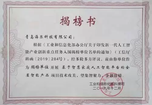 海尔智家成为新一代人工智能产业创新重点任务揭榜单位
