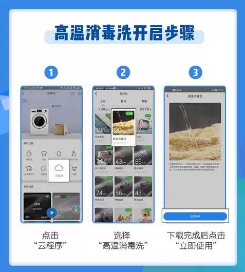 在海尔智家APP中,海尔洗衣机新设了“毛巾煮洗”、“高温消毒洗”、“消毒空气洗”云程序。只需要将衣物放入海尔智能洗衣机中,下载相应的云程序,一键启动,便可完成对衣物的消毒杀菌,是不是方便又容易呢?