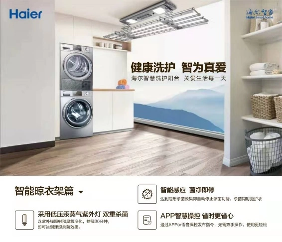 洗完的衣服,也可以放进海尔智慧阳台中的干衣护理机或智能晾衣架上,进行烘干或晾晒处理。将衣服放入海尔干衣护理机中,使用“除菌”功能,持续30分钟以上,便可实现对衣物的消毒杀菌。而智能晾衣架中的低压泵蒸汽紫外灯,在晾衣过程中就可达到杀菌效果,真正做到晾晒杀菌两不误。