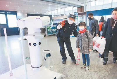 西安北站民警在进站口利用警用多功能机器人协助旅客进行红外体温监测。