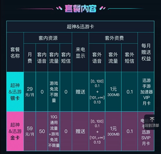 “尚·5G超神卡”一共包含两档套餐,分别为29元/月的银卡套餐和59元/月的金卡套餐,其中银卡套餐中包含了市场上所有移动端游戏免流不限量的超值福利以及迅游手游VIP会员,迅游的VIP会员支持加速多款手机游戏;而金卡套餐除了包含银卡套餐的内容外,更加享有迅游SVIP尊享会员,PC端和手机端的游戏都能够畅快加速。