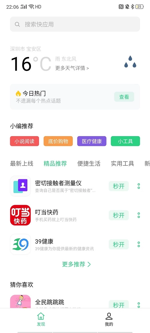 OPPO用户在手机终端设备上,通过下拉打开全局搜索、左滑至负一屏、唤起语音助手等相关操作,均可便捷的获取「密切接触者测量仪」快应用服务。快应用免安装、即点即用、场景丰富、易于留存等优势,能够使防疫宣传工作更快速更高效的落地。